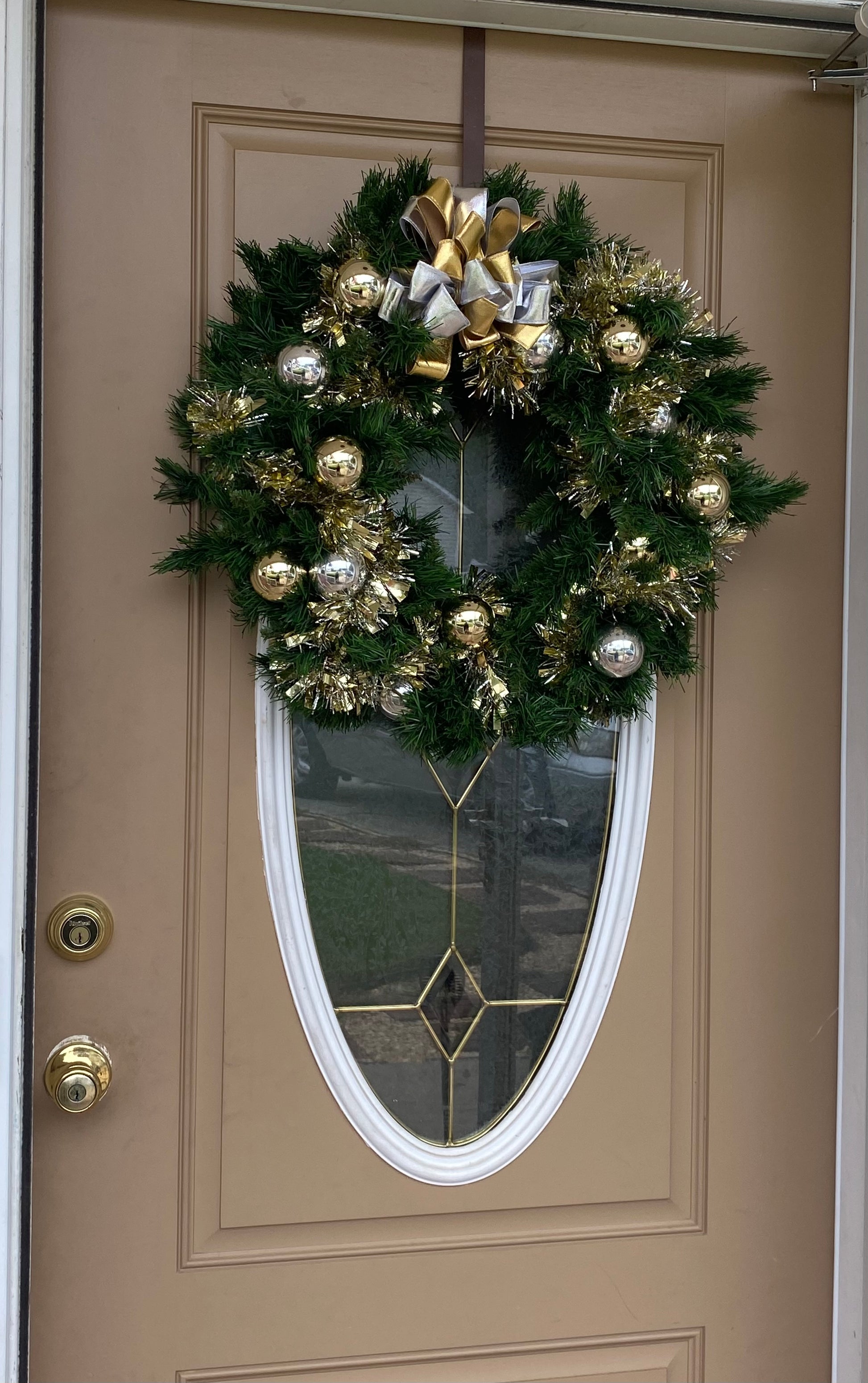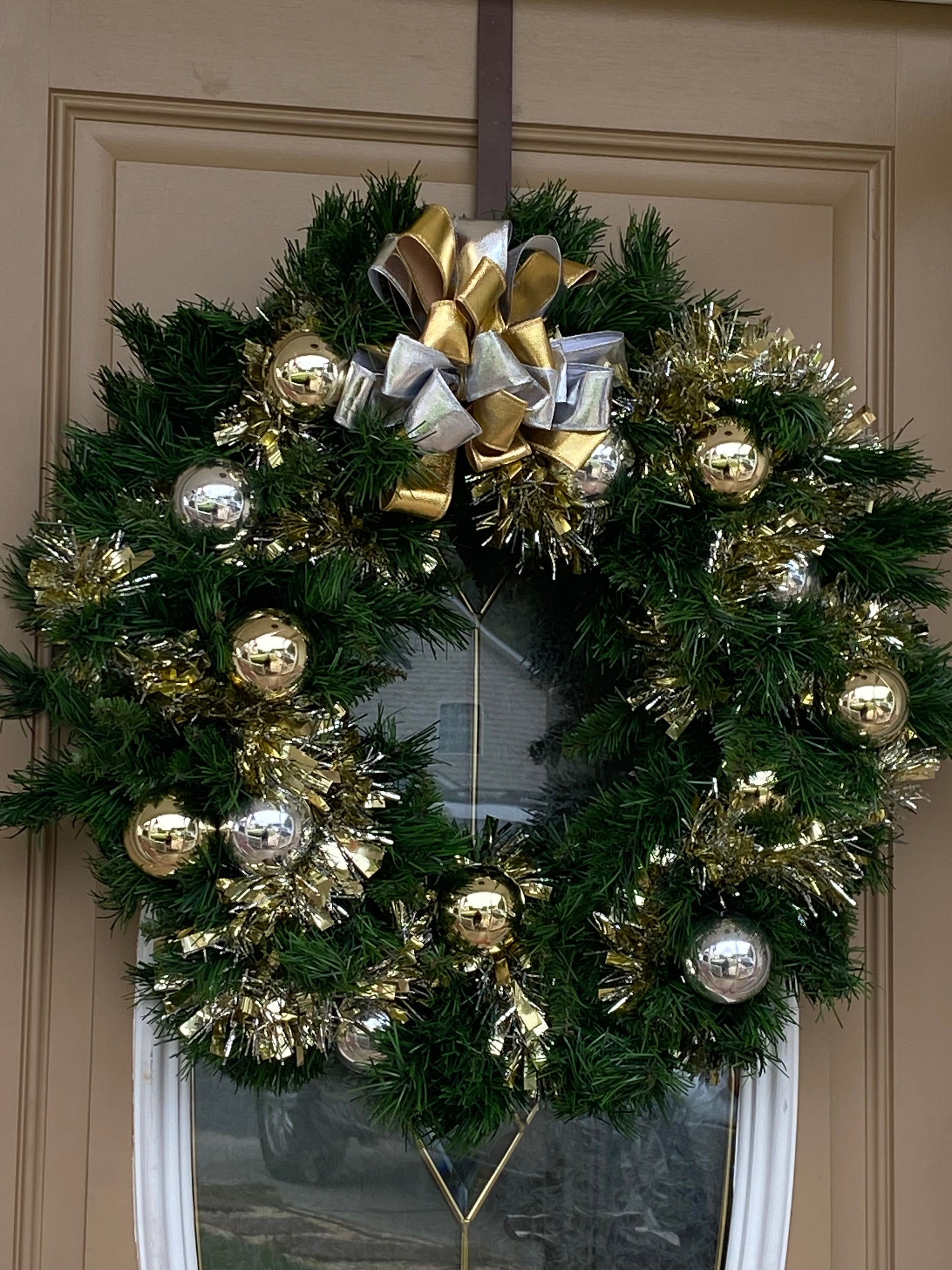 If you love the look and tradition of silver and gold this is the wreath for you. This beauty is covered in silver and gold balls with a bow to match. Perfect for anywhere you want the beauty and tradition without having to put alot out